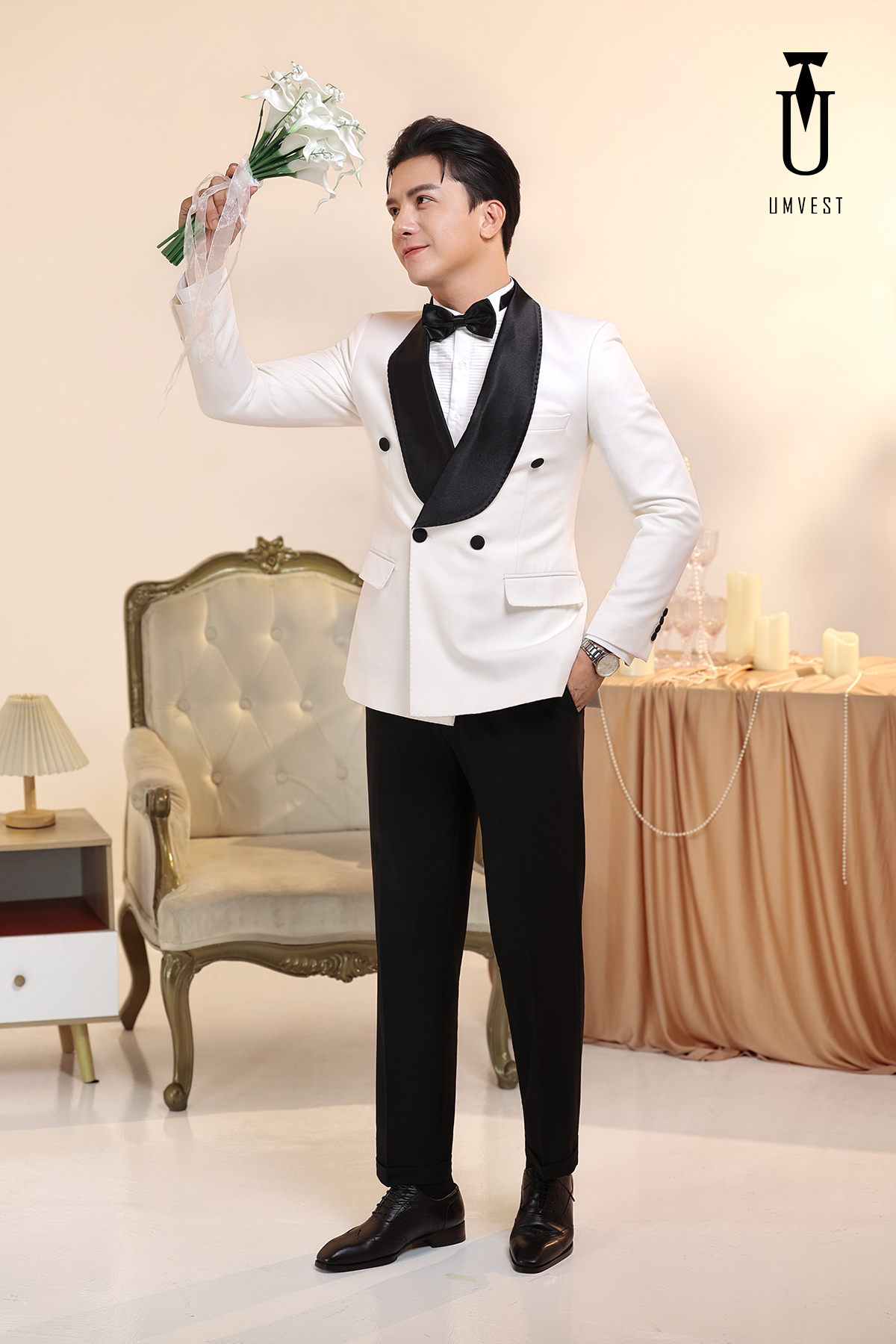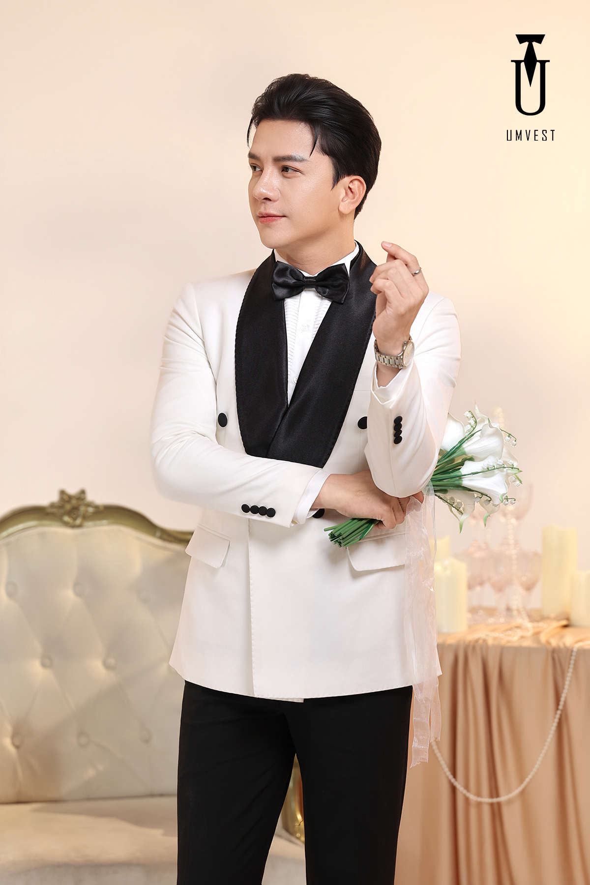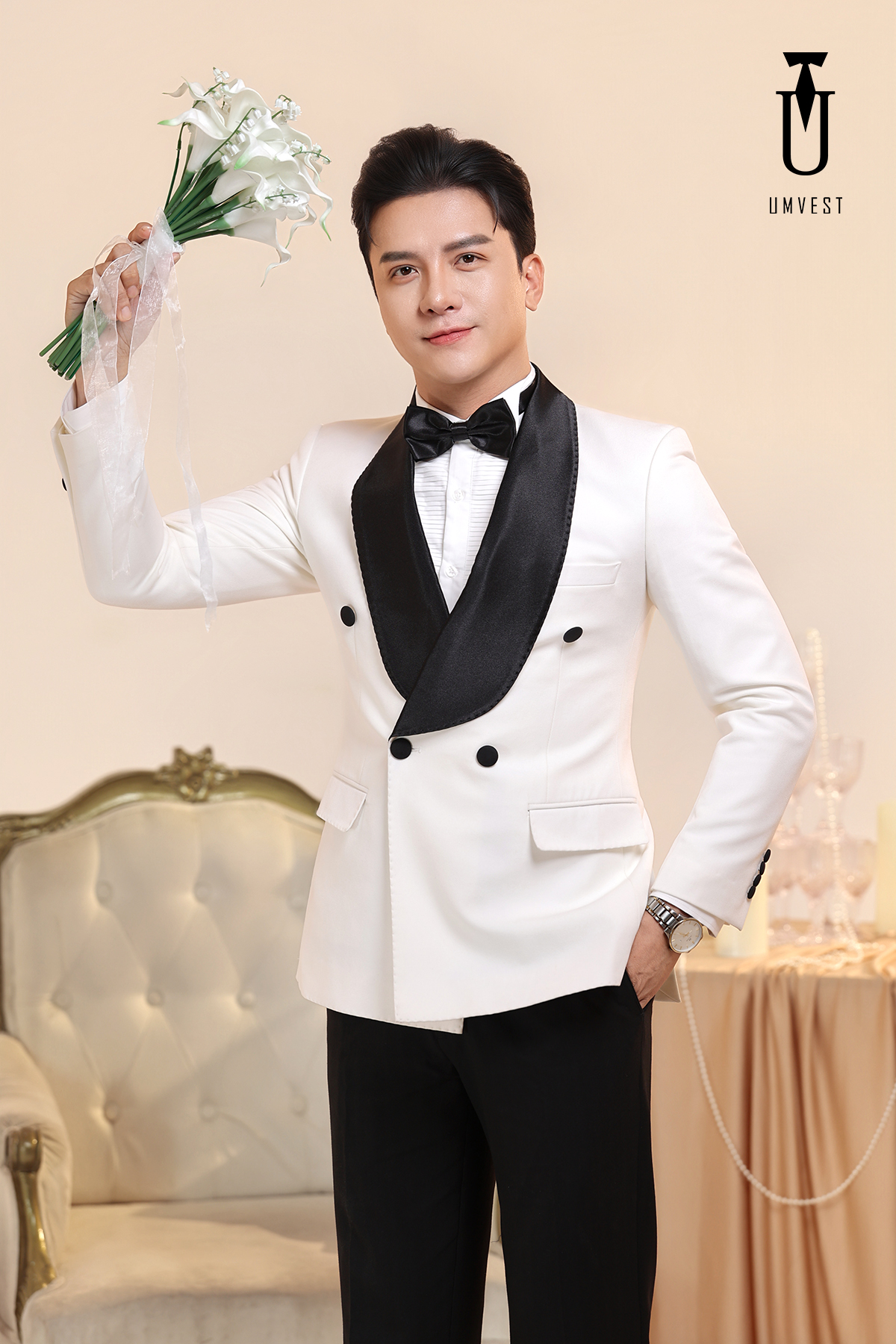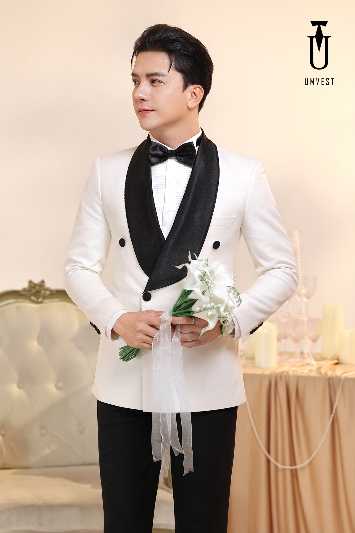Tuxedo Chú Rể Trắng Ve Sam Đen 6 Cúc