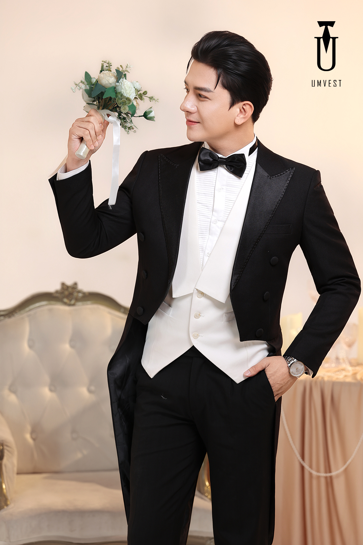 Vest Chú Rể Đuôi Tôm Đen Gile Trắng