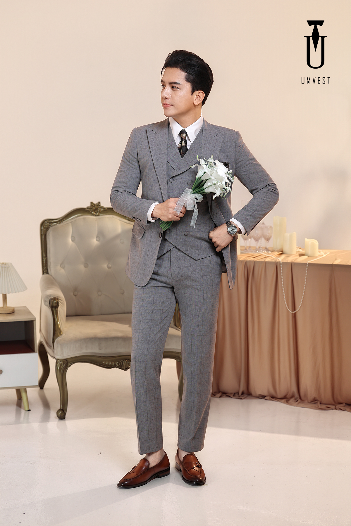 Vest Chú Rể Kẻ Xám Nhạt Gile Sam