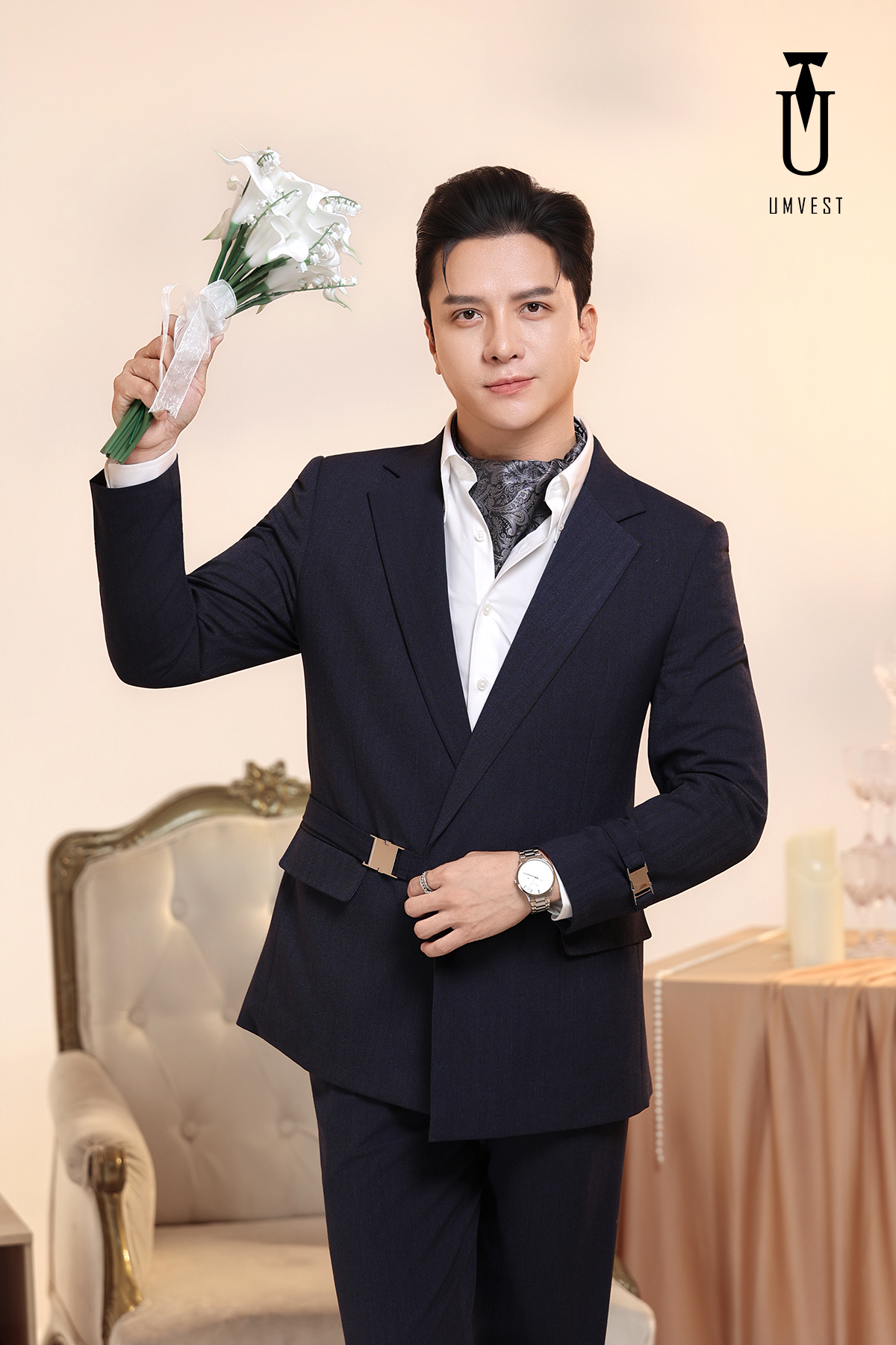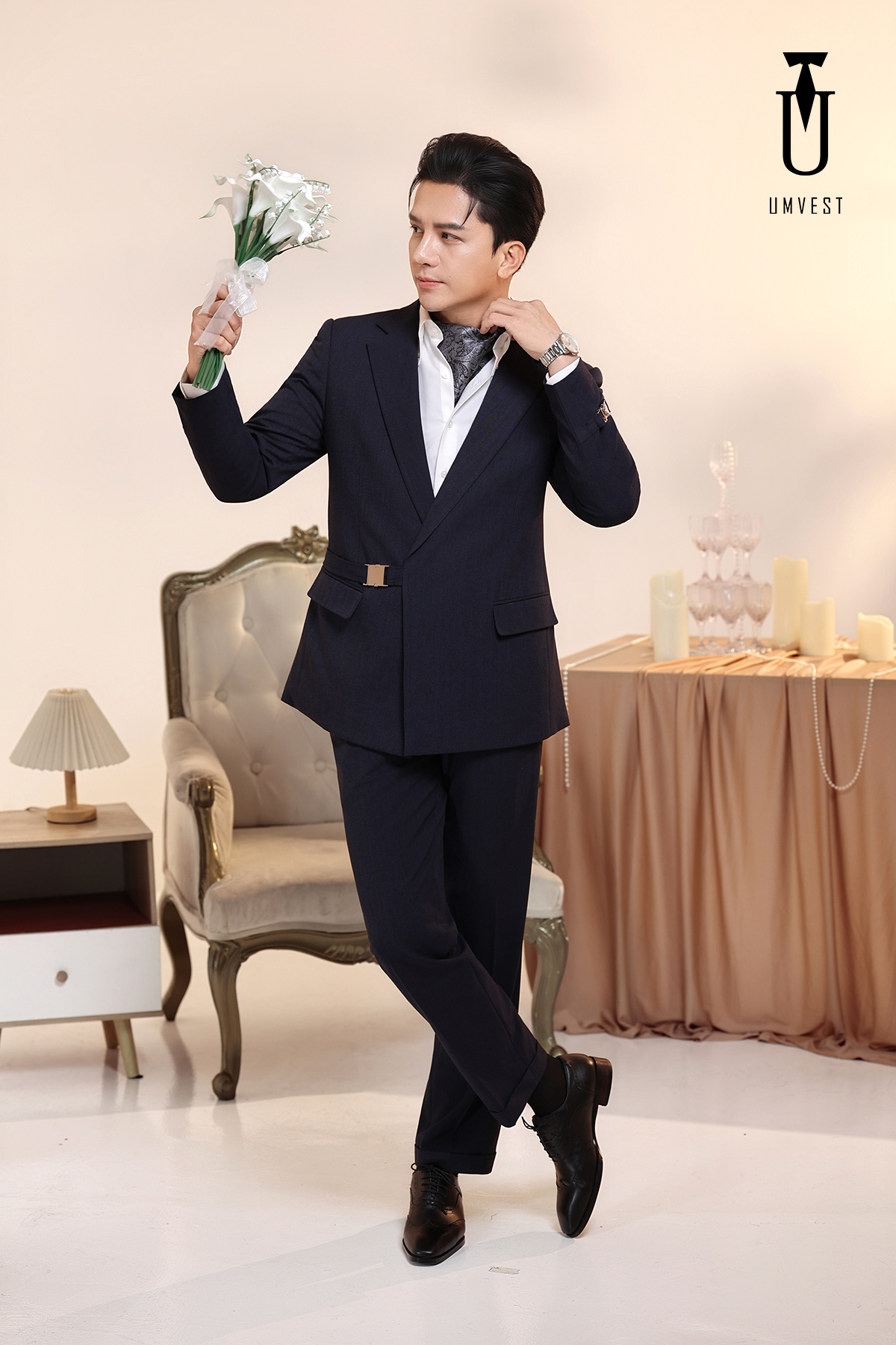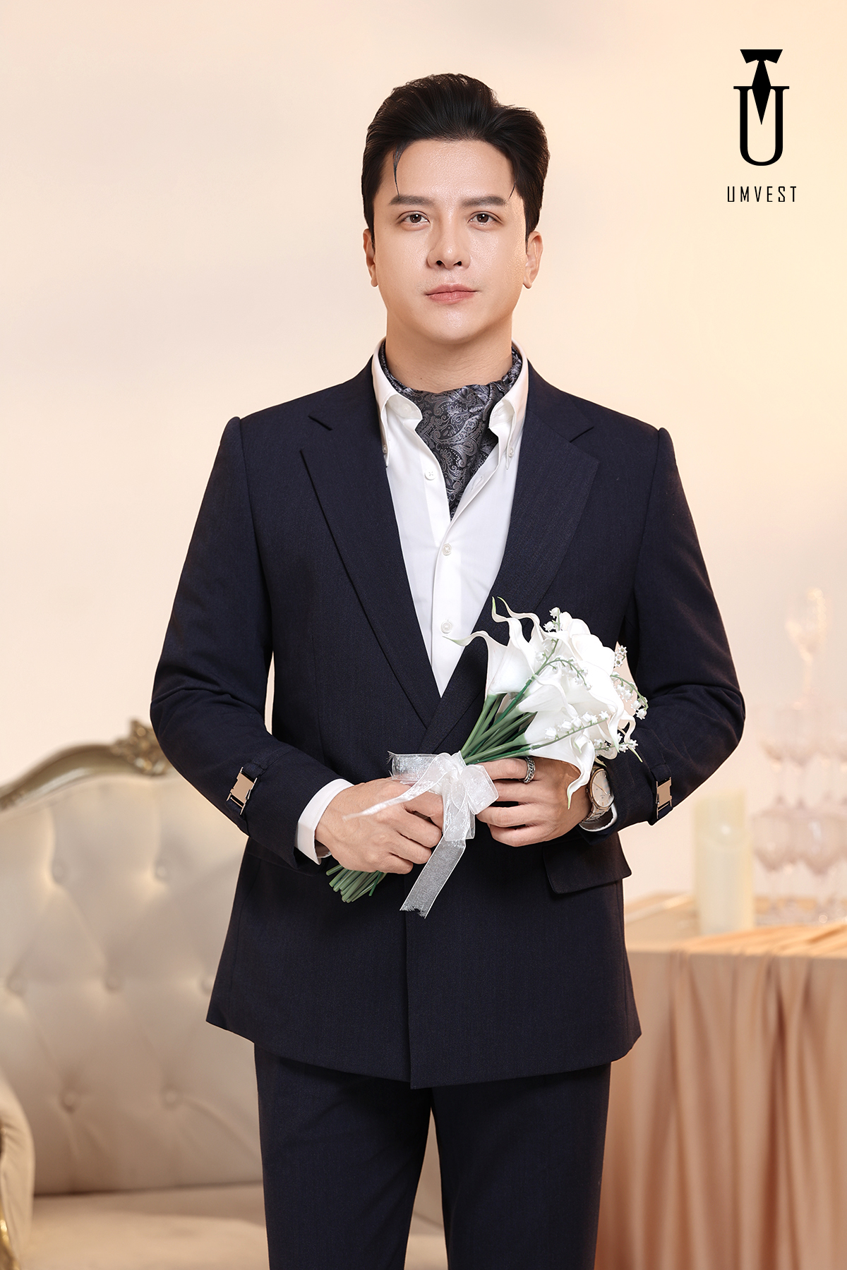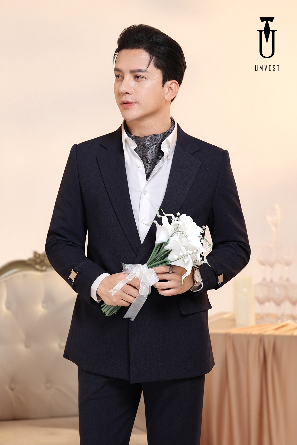 Vest Chú Rể Xanh Đen Khóa Sập Xương Cá